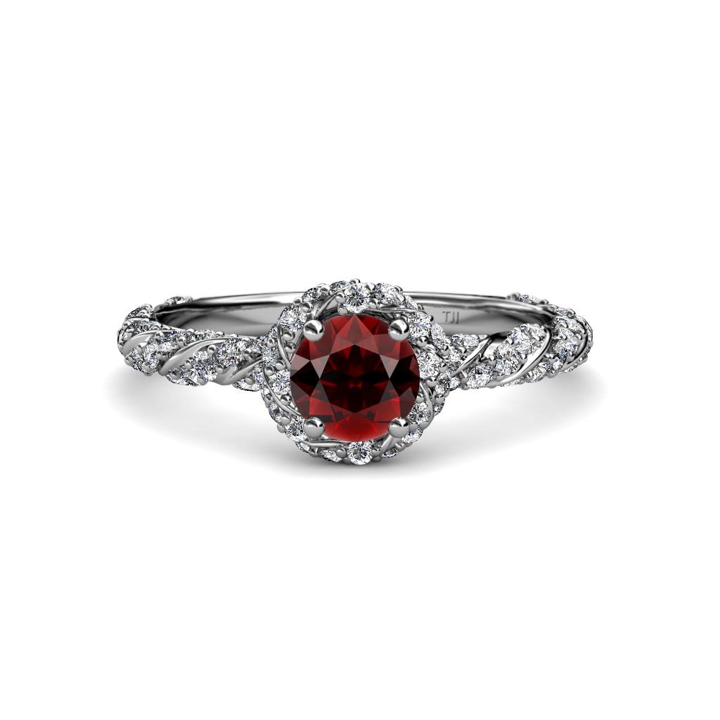Express Your love and ask her to be yours forever with this exquisite Halo Engagement Ring featuring Center Red Garnet in a 4 Prong Setting with Halo of single row Pave Set Diamonds overlapping by swirl rope single row Pave Shank.