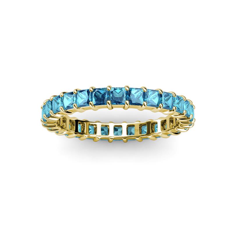 Sophisticated and mordenistic, this London Blue Topaz eternity band will give you an updated look with a classic design.This illuminating band features a perfect line of sparkling princess-cut London Blue Topaz in durable prong settings. This Princess Prong Set Eternity band is going to be her jewel of delight.