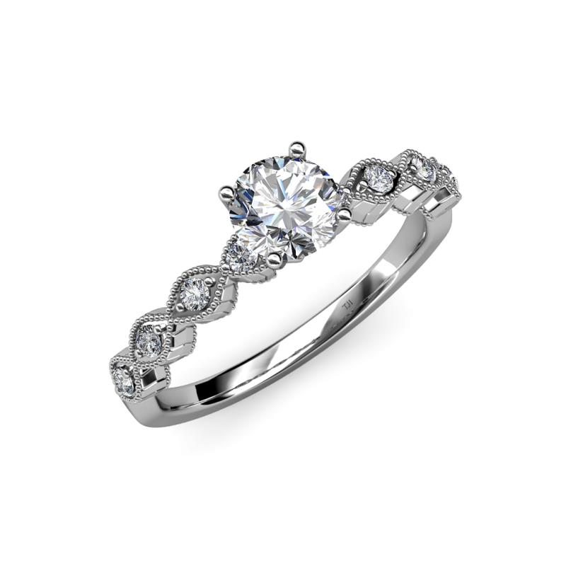 Ask her Hand in style with this charming Ring featuring spirals of milgrain edged Mioned Diamond encrusted ribbon that flank the Center Lab Grown Diamond with engraved ripples on the side making it an absolute stunner.