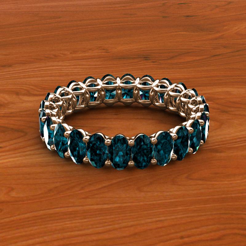 A Jewelry that is designed perfectly to make a truly special and unforgettable gift.This magnificient eternity band follows a series of Oval Shape London Blue Topaz that adds up pure glamour and excellence, with side gallery work and shared prong setting it displays a fine contemporary style look.
