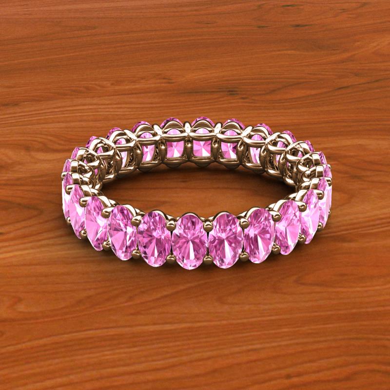 A Jewelry that is designed perfectly to make a truly special and unforgettable gift.This magnificient eternity band follows a series of Oval Shape Pink Sapphire that adds up pure glamour and excellence, with side gallery work and shared prong setting it displays a fine contemporary style look. *As per ring size the stone and carat total weight changes.
