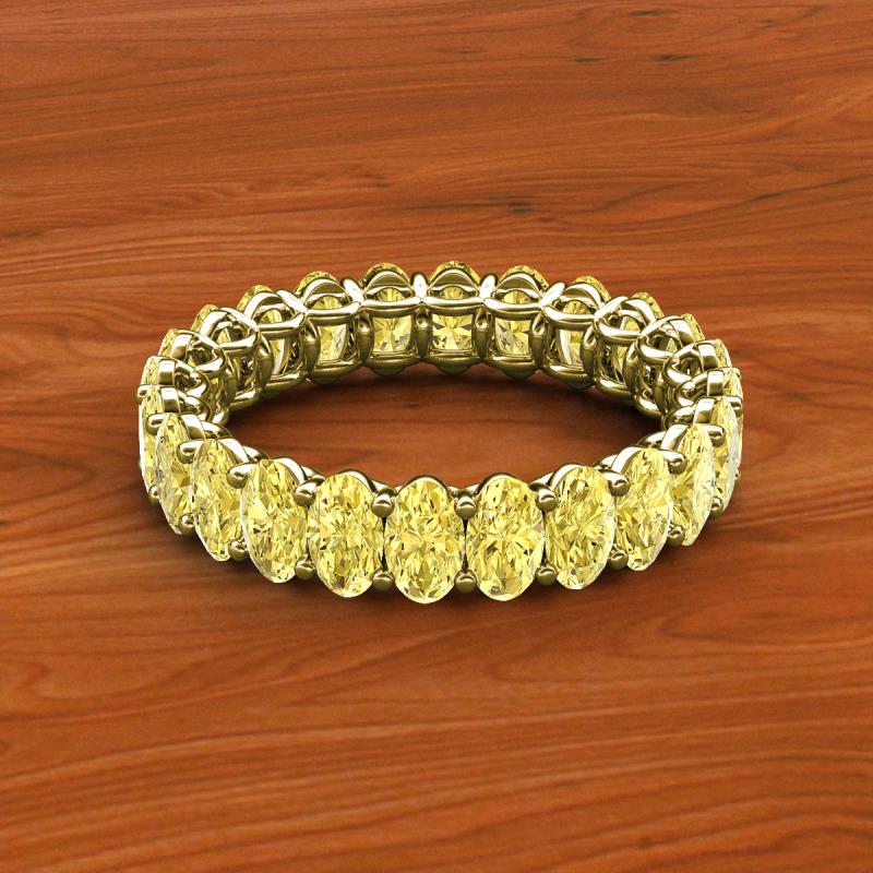 A Jewelry that is designed perfectly to make a truly special and unforgettable gift.This magnificient eternity band follows a series of Oval Shape Yellow Sapphire that adds up pure glamour and excellence, with side gallery work and shared prong setting it displays a fine contemporary style look. *As per ring size the stone and carat total weight changes.