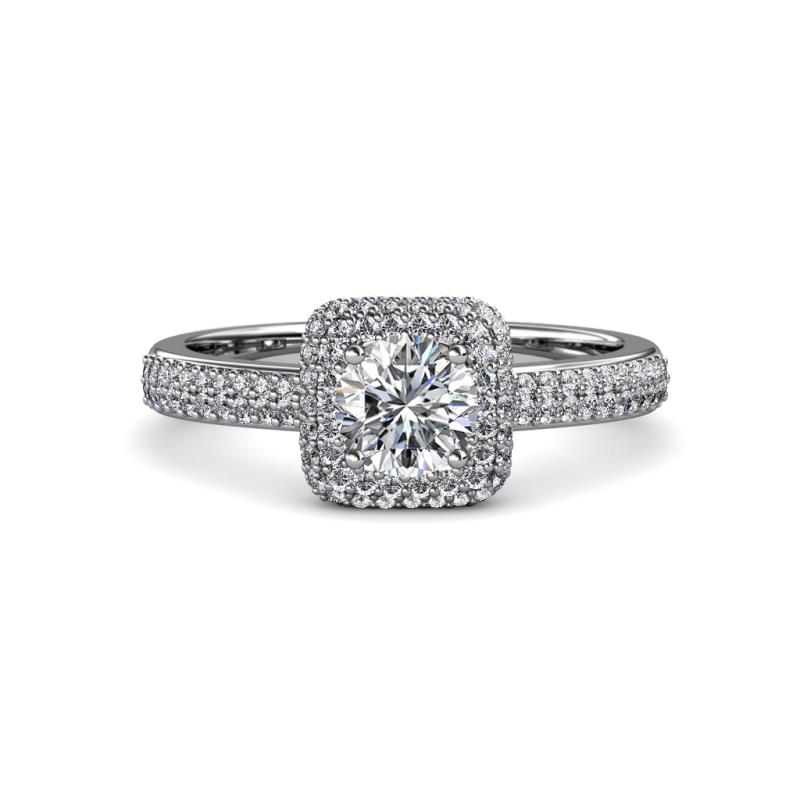 This Dazzling Halo Engagement Ring has 4 Prong Center Round Diamond surrounded by Double Row square outline and Double Row Shank of Pave Set Diamonds making it a truly Sparkling Accessory.