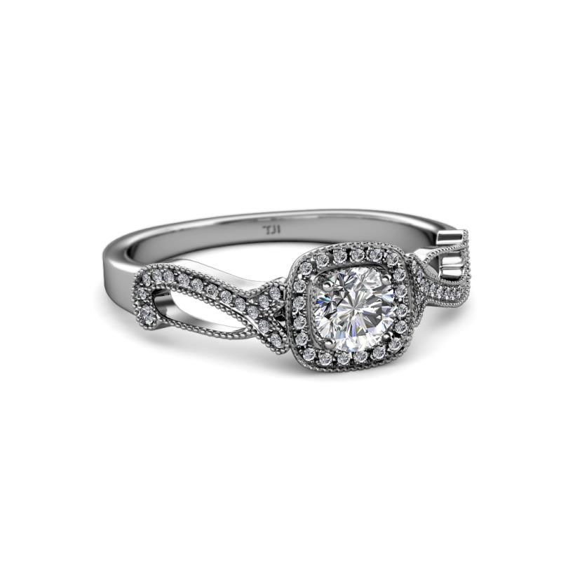 This Milgrain Work Swirl Engagement Ring of 1.05 ctw is a classic beauty that will surely make her say yes, surrounding the Center IGI Certified Lab Grown Diamond by Cushion Frame Halo of Natural Diamonds along with diamonds surrounded on either side of Center Stone and Yellow Gold Gallery Work below the Head.