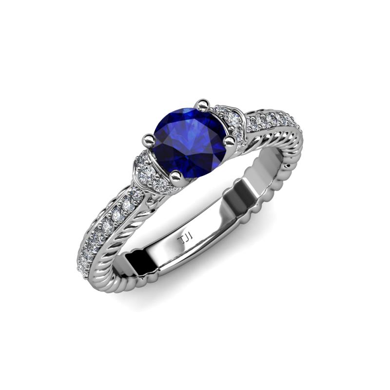 This Glamorous Engagement Ring features Center Blue Sapphire flanked by series of Diamonds further forming remarkable combination with bubble cable design making it extraordinary and vintage.