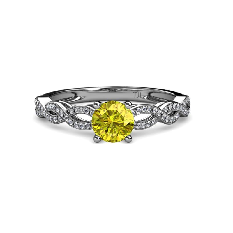 Honour the one You love by this Infinity Engagement Ring with 4 Prong Center Yellow Diamond and open split crossover Shank framed by Pave Set smaller accent White Diamonds will surely make one's Heart flutter.