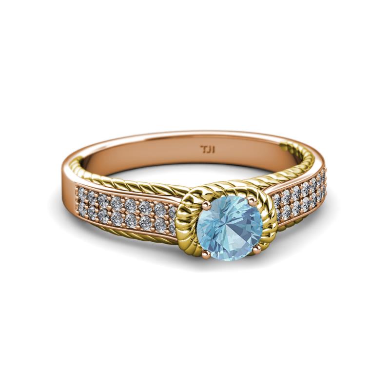 This Elegantly Designed Two Tone Solitaire Plus Engegement Ring in 18K Rose Gold have Double Row of Diamonds with Aquamarine that is artstically surrounded with Yellow Gold Rope which continues to adorn the Shank overlapping below the Head giving a Heavenly beauty and timeless Elegance.