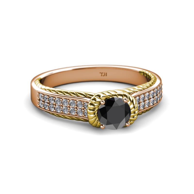 This Elegantly Designed Two Tone Solitaire Plus Engegement Ring in 18K Rose Gold have Double Row of Diamonds with Black Diamond that is artstically surrounded with Yellow Gold Rope which continues to adorn the Shank overlapping below the Head giving a Heavenly beauty and timeless Elegance.