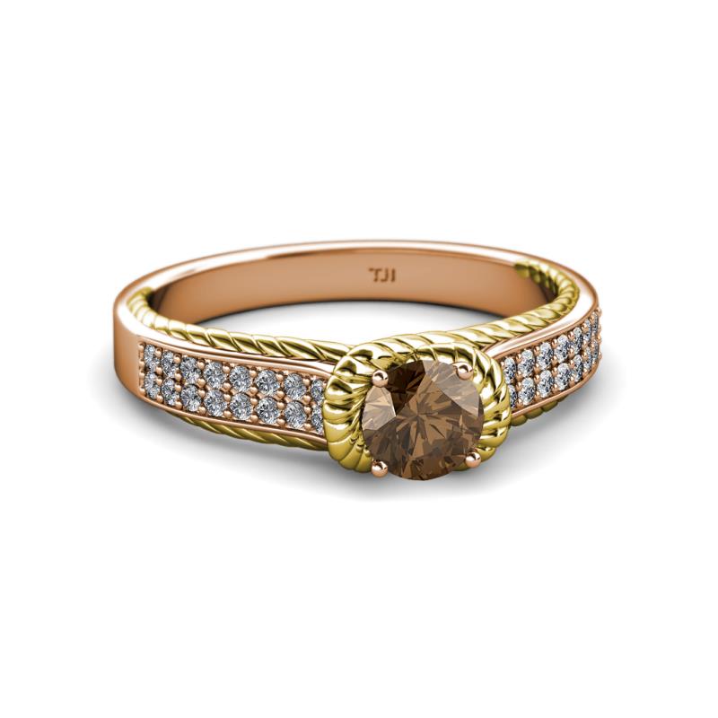 This Elegantly Designed Two Tone Solitaire Plus Engegement Ring in 14K Rose Gold have Double Row of Diamonds with Smoky Quartz that is artstically surrounded with Yellow Gold Rope which continues to adorn the Shank overlapping below the Head giving a Heavenly beauty and timeless Elegance.