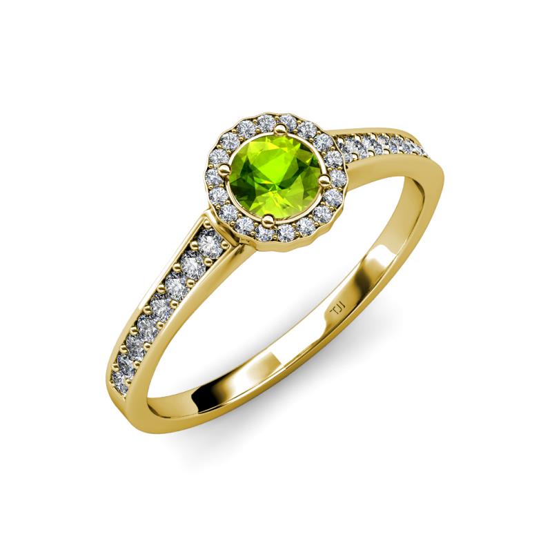 Celebrate the priceless moment of your life with 0.99 ct tw Halo Engagement Ring with Center Peridot flared by halo of Diamonds which continue to illuminate the shank making it a symbol of your unending love.