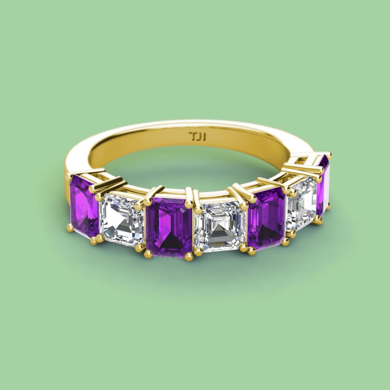 Looking for a vintage style wedding band? Look no further. This band features a center Four Emerald Cut Amethyst plus three Asscher Cut Diamond is stunning enough to stand alone.