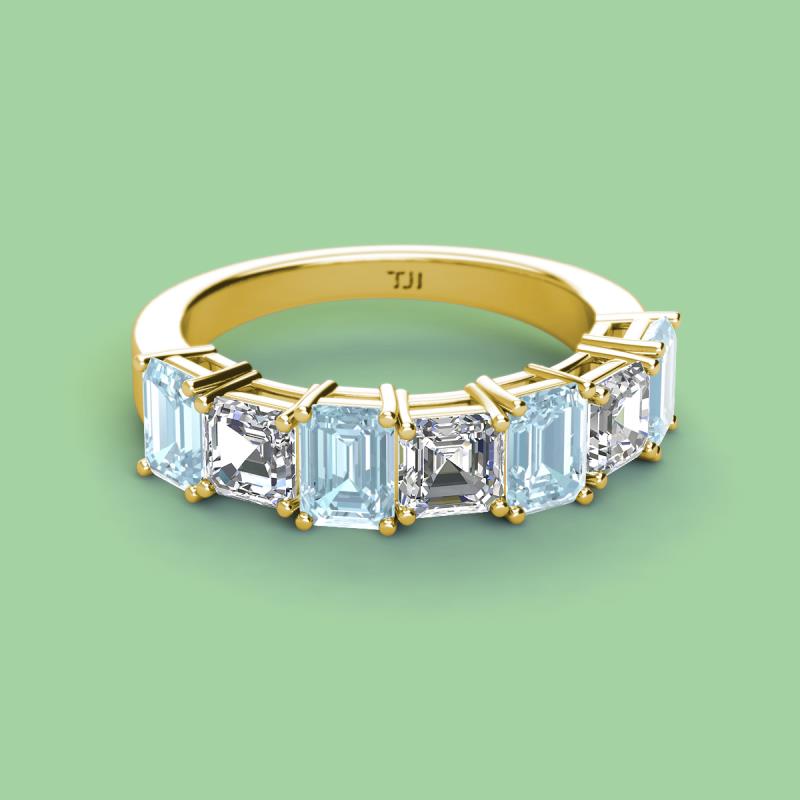 • 4 Emerald Cut Aquamarine of 1.80 ctw/6x4 mm and 3 Asscher Cut Diamond of 1.50 ctw/4.5 mm set using Shared Prong Setting.