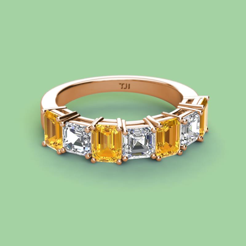 • 4 Emerald Cut Citrine of 2.24 ctw/6x4 mm and 3 Asscher Cut Diamond of 1.50 ctw/4.5 mm set using Shared Prong Setting.