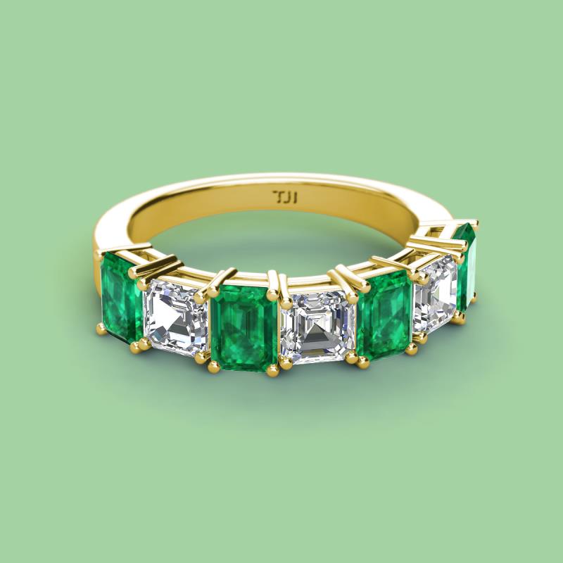 Looking for a vintage style wedding band? Look no further. This band features a center Four Emerald Cut Emerald plus three Asscher Cut Diamond is stunning enough to stand alone.
