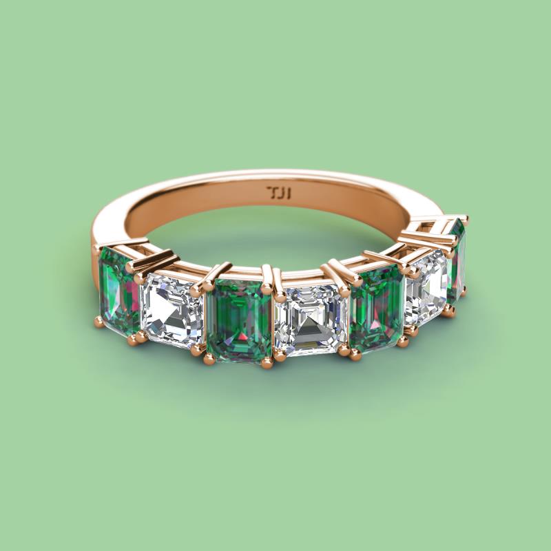 • 4 Emerald Cut Lab Created Alexandrite of 2.60 ctw/6x4 mm and 3 Asscher Cut Diamond of 1.50 ctw/4.5 mm set using Shared Prong Setting.