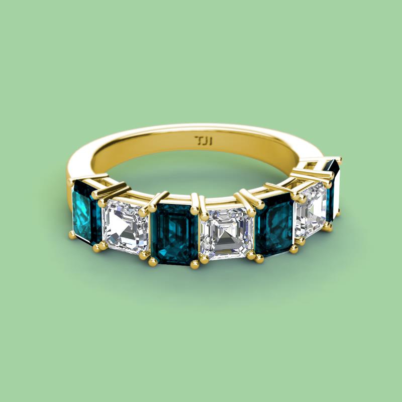 Looking for a vintage style wedding band? Look no further. This band features a center Four Emerald Cut London Blue Topaz plus three Asscher Cut Diamond is stunning enough to stand alone.