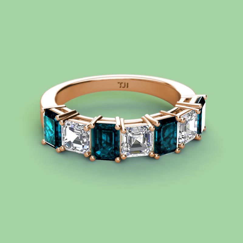 • 4 Emerald Cut London Blue Topaz of 2.60 ctw/6x4 mm and 3 Asscher Cut Diamond of 1.50 ctw/4.5 mm set using Shared Prong Setting.