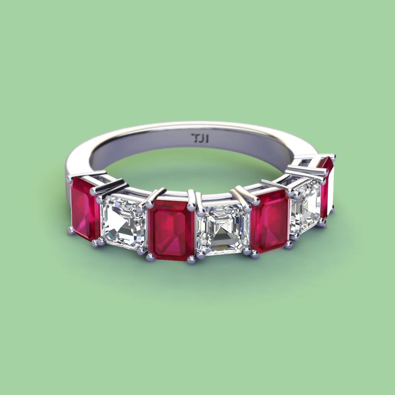 Looking for a vintage style wedding band? Look no further. This band features a center Four Emerald Cut Ruby plus three Asscher Cut Diamond is stunning enough to stand alone.