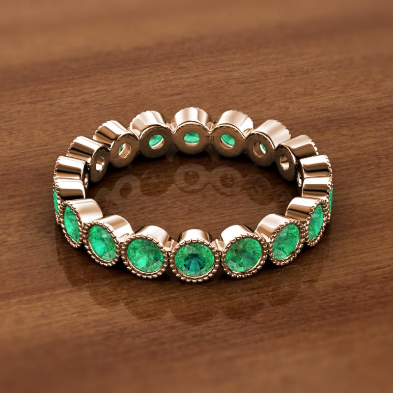 This Elegant Eternity Band of 1.70 ctw encircles the finger with Series of Created Emerald in Milgrain-Texture with Bezel Setting which symbolizes the Eternal Circle of Love and cherishes its Shimmery Look.