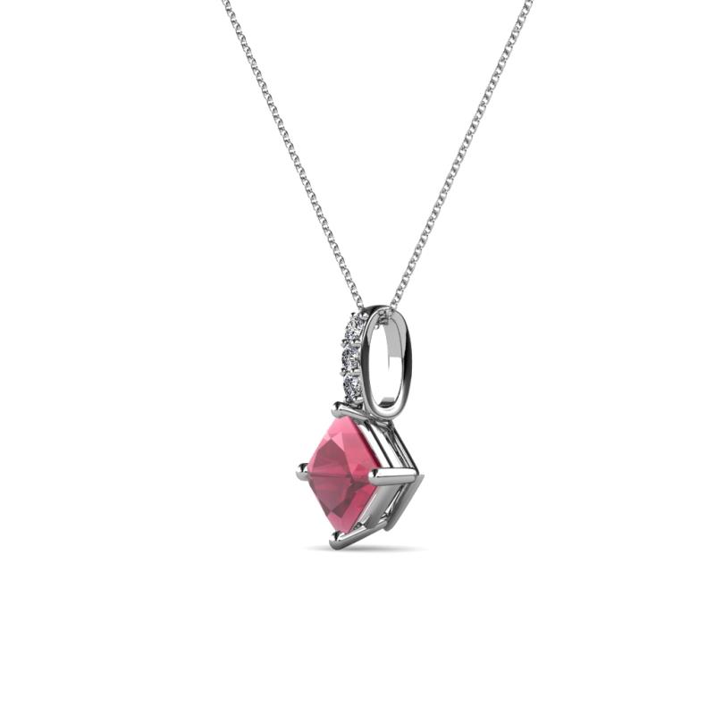 Magnificent and Radiant,this 1.00 ct tw Pendant holds a stunning Princess Cut Rhodolite Garnet with Round Diamond embellished bail giving it a fascinating look.
