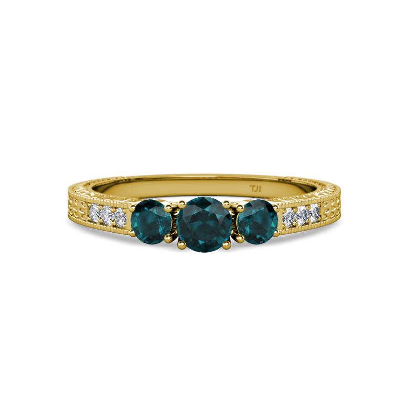 A stunning Center London Blue Topaz flanked by two London Blue Topaz shines with smaller round Diamond adorn this Milgrain Engagement Ring decorated with engraved edges making it look vintage and royal.