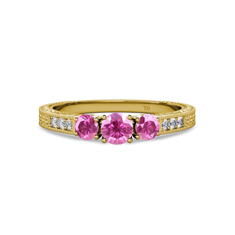 A stunning Center Pink Sapphire flanked by two Pink Sapphire shines with smaller round Diamond adorn this Milgrain Engagement Ring decorated with engraved edges making it look vintage and royal.