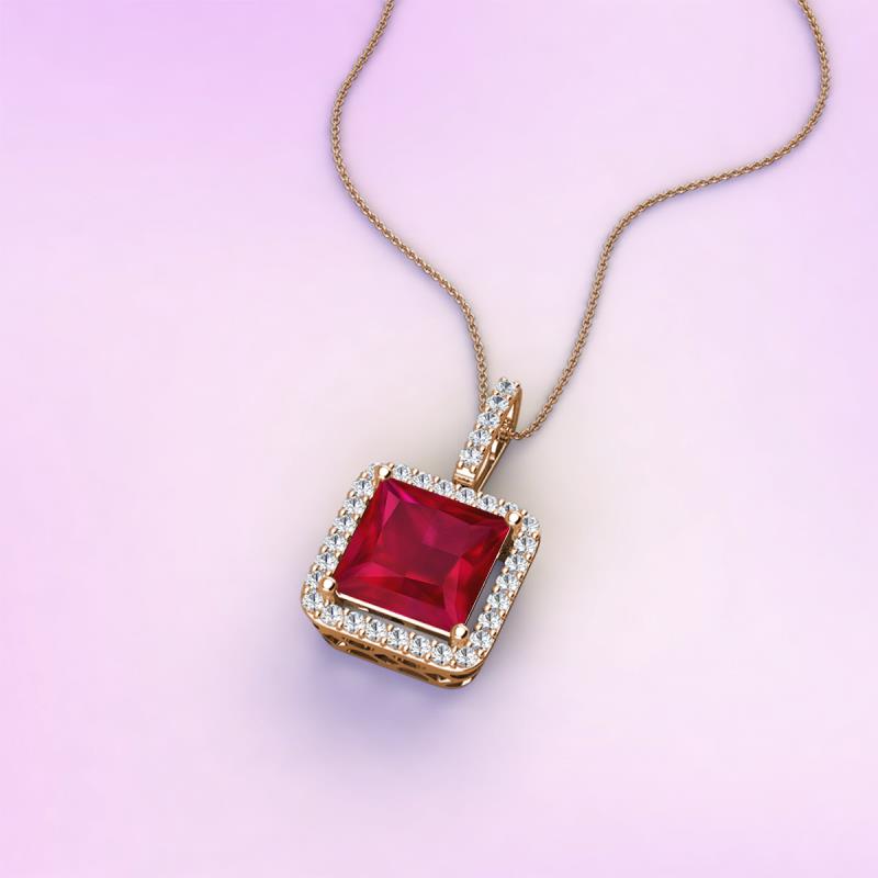 Radiating a luxurious aura, this diamond halo pendant with Princess Cut Lab Created Ruby set within a halo of shimmering diamonds is the perfect way to add a touch of elegance to any ensemble.