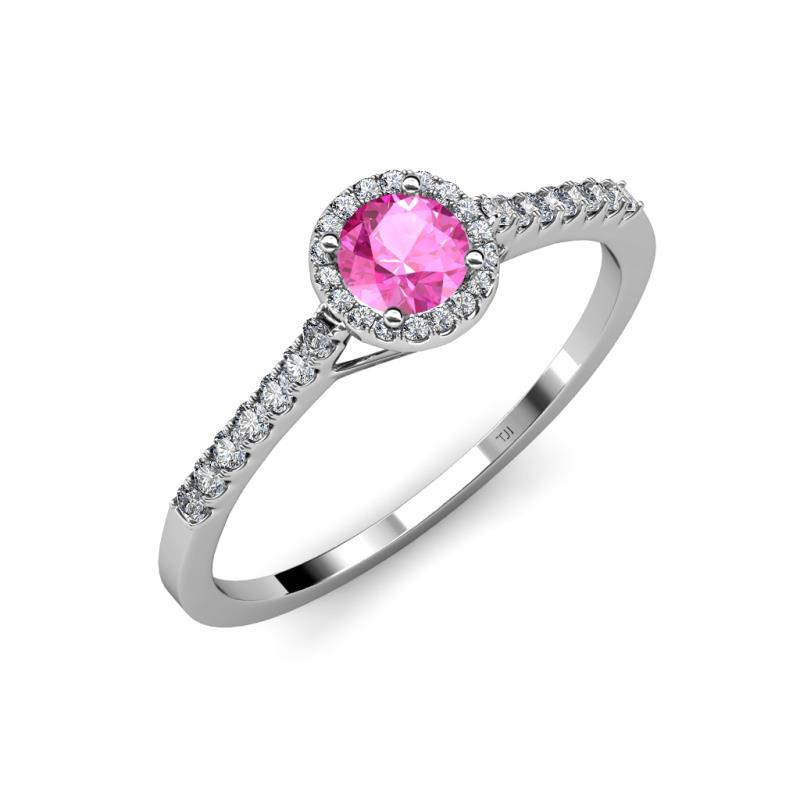 Express your desire to Grow old with her with this 0.97 ct tw Halo Engagement Ring with Center Pink Sapphire embraced by halo of Diamonds which adds beauty to it.