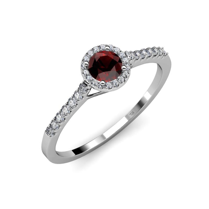 Express your desire to Grow old with her with this 0.99 ct tw Halo Engagement Ring with Center Red Garnet embraced by halo of Diamonds which adds beauty to it.