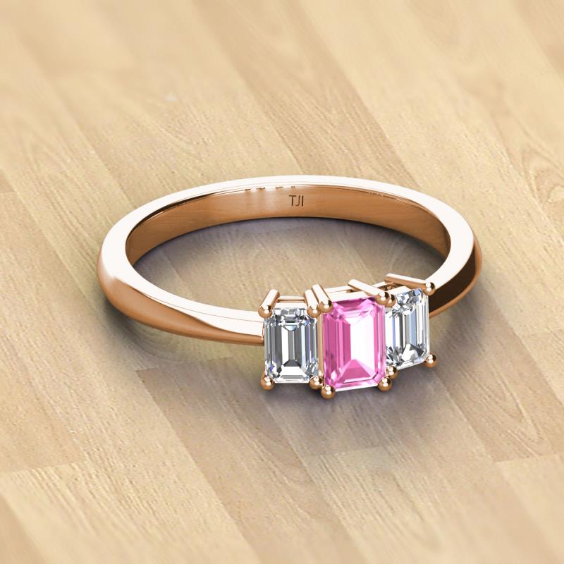 • 1 Emerald Cut Pink Sapphire of 0.70 ct/6x4 mm and 2 Emerald Cut Lab Grown Diamond of 0.70 ctw/5x3 mm set using Prong Setting.