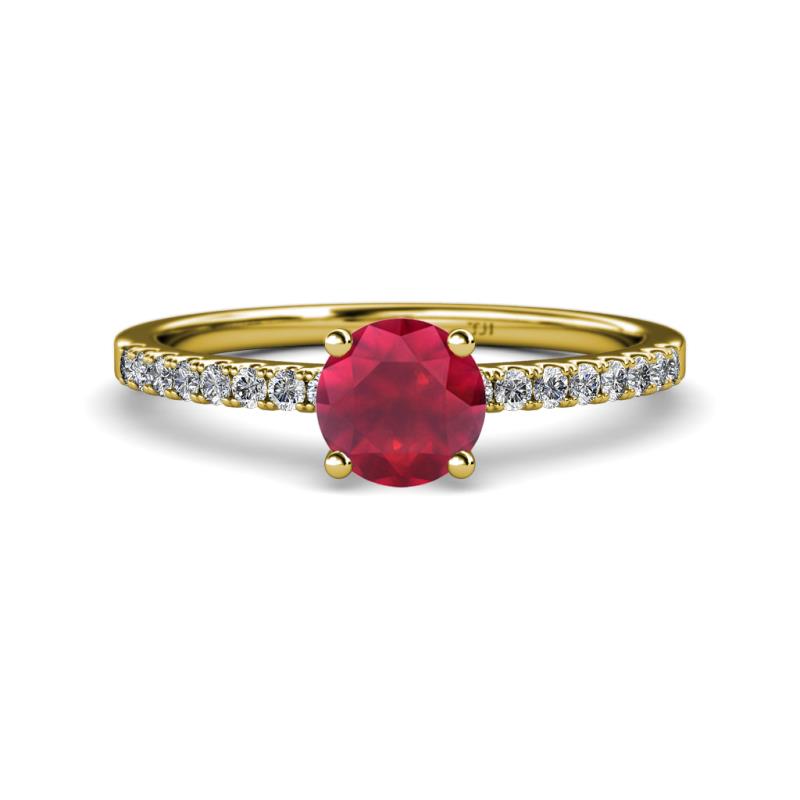 This Elegant Solitaire Plus Engagement Rings holds a Center Ruby in 4 Prong Setting with single row of Diamonds in cut down Pave Shank is an exquisite reminder of the Love you share.