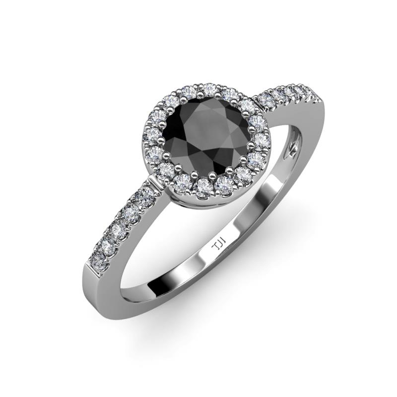 This glorious Engagement Ring,the most popular style of today features a halo of White Diamond which wraps the Center Black Diamond with additional White Diamonds on either sides providing an elegant touch to complete the Ring.