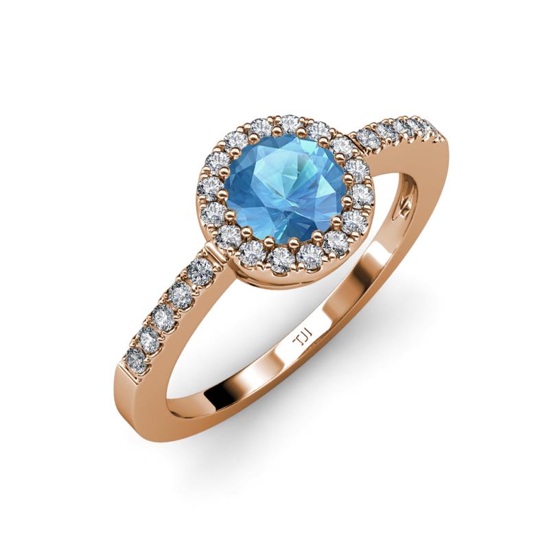 This glorious Engagement Ring,the most popular style of today features a halo of diamond which wraps the Center Blue Topaz with additional Diamonds on either sides providing an elegant touch to complete the Ring.