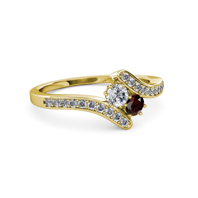 Designed with a meaningful expression of love, this Ring have mesmerizing combination of Lab Grown Diamond & Red Garnet which represents you & your loved one embraced by fascinating Diamond bypass shank symbolizing that your life revolves around each other.