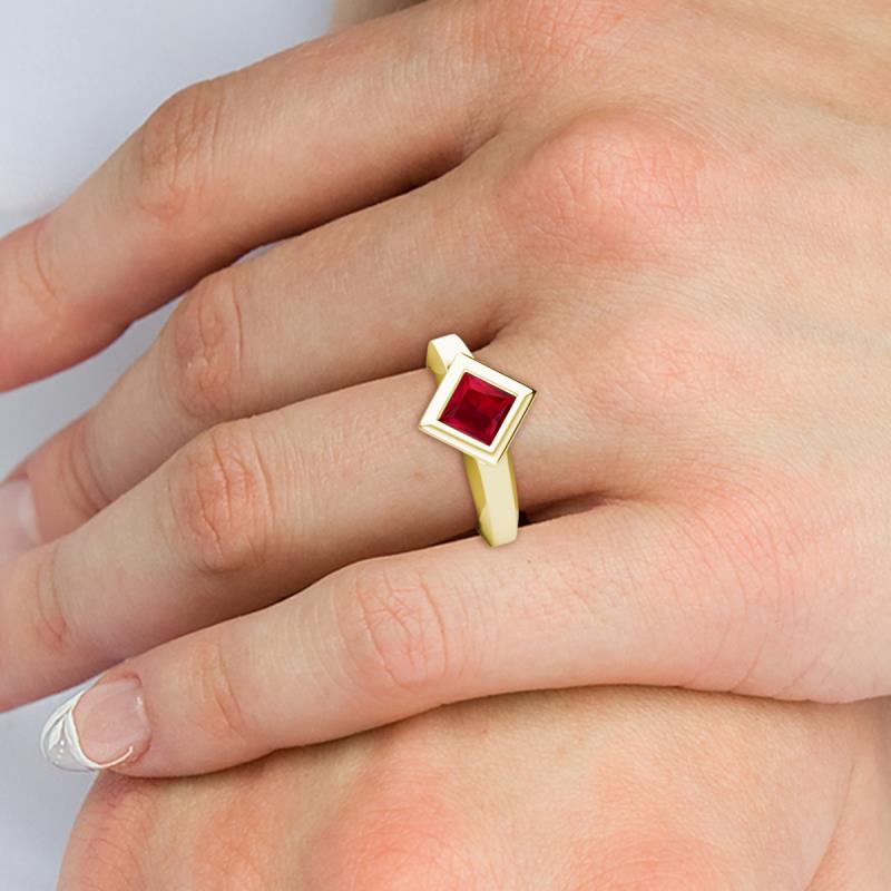 This Solitaire Ring have Princess Cut Lab Created Ruby surrounded elegantly by bezel setting making it more Graceful in its Simplicity.