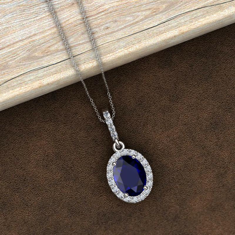 The sparkling Halo of Round Diamond surrounds the Center Oval Cut Blue Sapphire completing this adorable Pendant with Cable Chain which becomes an ideal for any and every occasion.