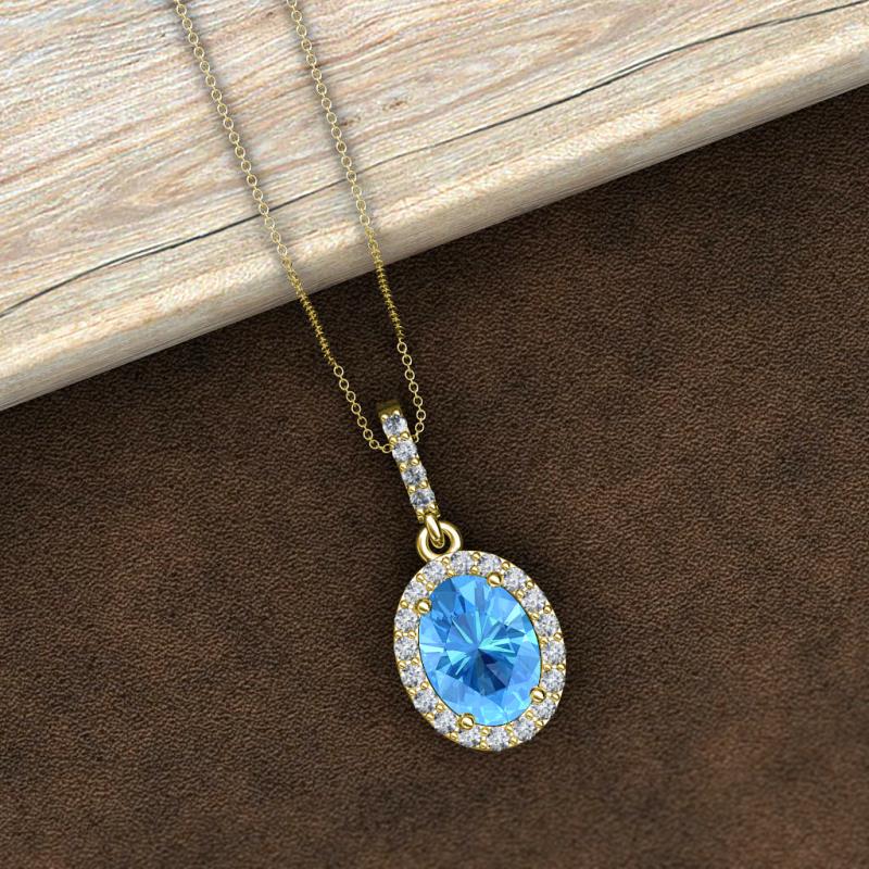Oval Cut (8x6 mm) Blue Topaz and Round Diamond 1 3/4 ctw Womens Halo Pendant Necklace 14K Yellow Gold.Included 16 Inches 14K Yellow Gold Chain More Details ...