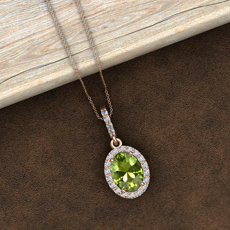 Oval Cut (8x6 mm) Peridot and Round Diamond 1 3/4 ctw Womens Halo Pendant Necklace 14K Rose Gold.Included 16 Inches 14K Rose Gold Chain More Details ...
