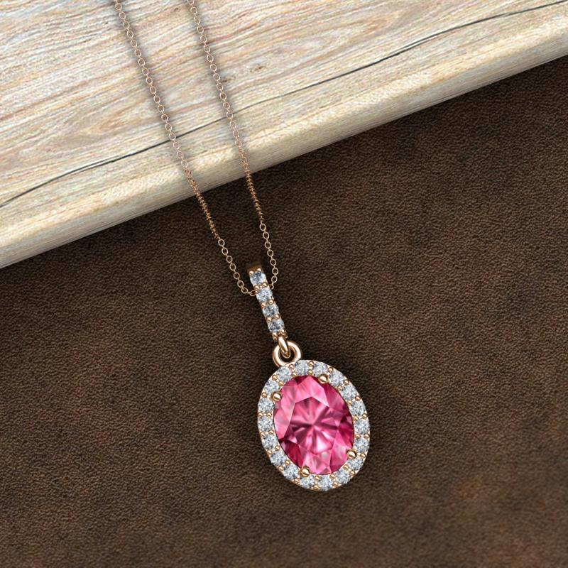 Oval Cut (8x6 mm) Pink Tourmaline and Round Diamond 1 1/2 ctw Womens Halo Pendant Necklace 14K Rose Gold.Included 16 Inches 14K Rose Gold Chain More Details ...