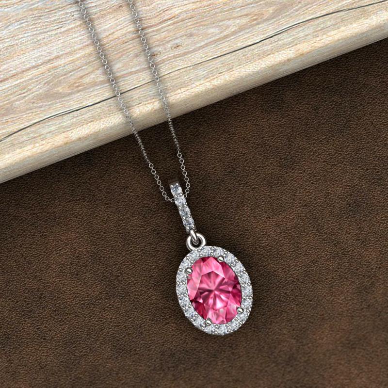 The sparkling Halo of Round Diamond surrounds the Center Oval Cut Pink Tourmaline completing this adorable Pendant with Cable Chain which becomes an ideal for any and every occasion.