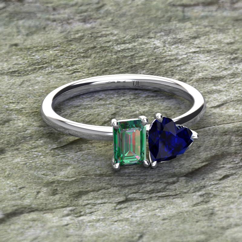 Simple and beautiful, this enchanting 2 Stone Duo Ring flaunting an Emerald Shape Lab Created Alexandrite dazzling along with Heart Shape Lab Created Blue Sapphire are perfect for the women who have a modern outlook and are willing to be unique.