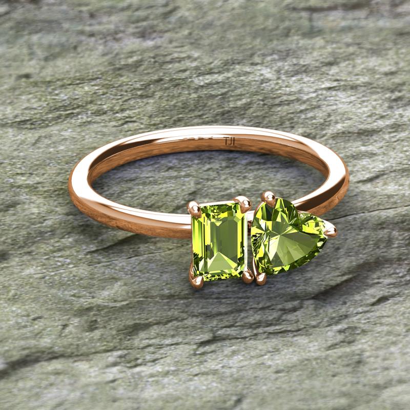 Simple and beautiful, this enchanting 2 Stone Duo Ring flaunting an Emerald Shape Peridot dazzling along with Heart Shape Peridot are perfect for the women who have a modern outlook and are willing to be unique.