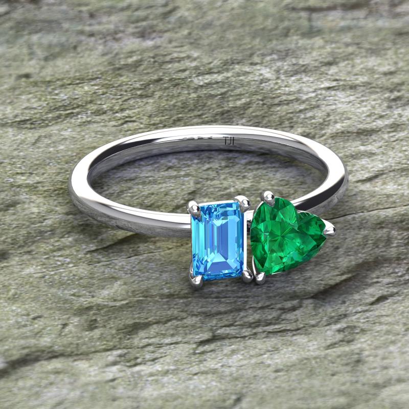 Simple and beautiful, this enchanting 2 Stone Duo Ring flaunting an Emerald Shape Blue Topaz dazzling along with Heart Shape Lab Created Emerald are perfect for the women who have a modern outlook and are willing to be unique.