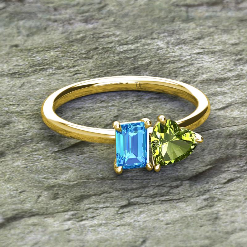 Simple and beautiful, this enchanting 2 Stone Duo Ring flaunting an Emerald Shape Blue Topaz dazzling along with Heart Shape Peridot are perfect for the women who have a modern outlook and are willing to be unique.