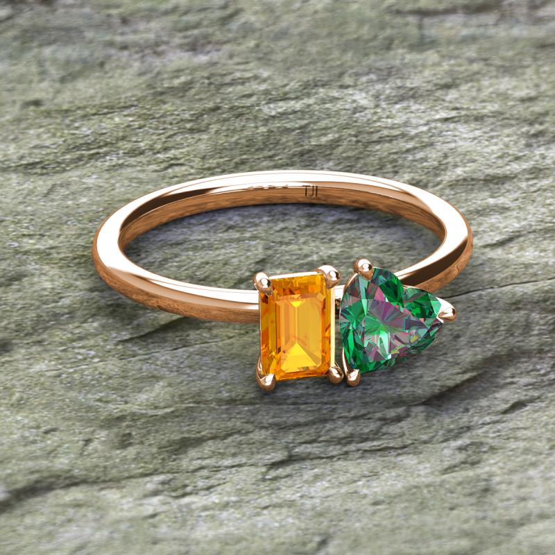 Simple and beautiful, this enchanting 2 Stone Duo Ring flaunting an Emerald Shape Citrine dazzling along with Heart Shape Lab Created Alexandrite are perfect for the women who have a modern outlook and are willing to be unique.
