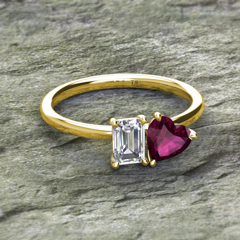 Simple and beautiful, this enchanting 2 Stone Duo Ring flaunting an Emerald Shape Forever One Moissanite dazzling along with Heart Shape Rhodolite Garnet are perfect for the women who have a modern outlook and are willing to be unique.