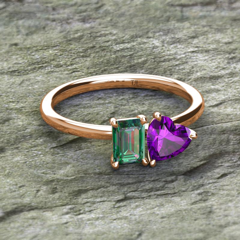Simple and beautiful, this enchanting 2 Stone Duo Ring flaunting an Emerald Shape Lab Created Alexandrite dazzling along with Heart Shape Amethyst are perfect for the women who have a modern outlook and are willing to be unique.