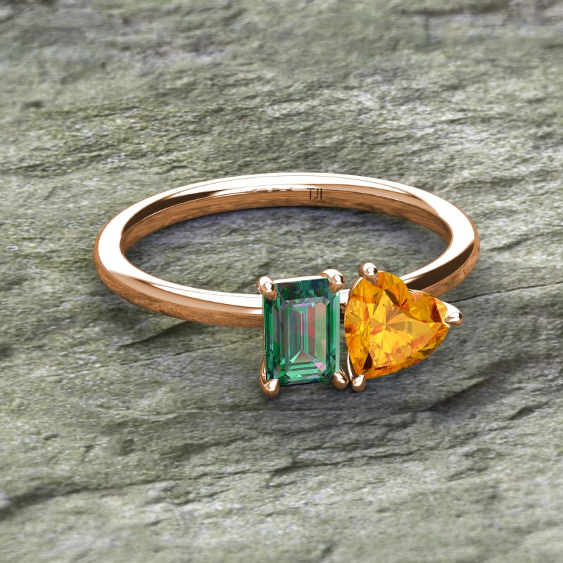 Simple and beautiful, this enchanting 2 Stone Duo Ring flaunting an Emerald Shape Lab Created Alexandrite dazzling along with Heart Shape Citrine are perfect for the women who have a modern outlook and are willing to be unique.