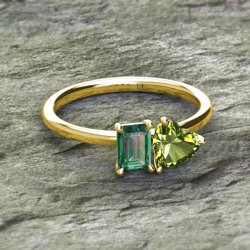 Simple and beautiful, this enchanting 2 Stone Duo Ring flaunting an Emerald Shape Lab Created Alexandrite dazzling along with Heart Shape Peridot are perfect for the women who have a modern outlook and are willing to be unique.