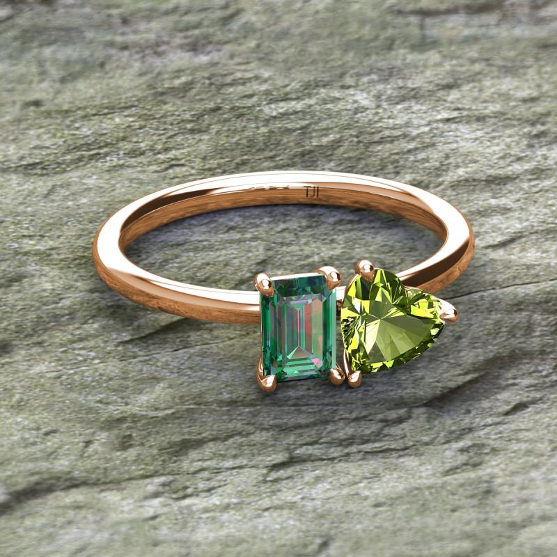 Simple and beautiful, this enchanting 2 Stone Duo Ring flaunting an Emerald Shape Lab Created Alexandrite dazzling along with Heart Shape Peridot are perfect for the women who have a modern outlook and are willing to be unique.